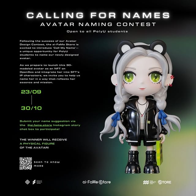Following the success of our Avatar Design Contest, the ai-FaMe Store is excited to introduce 'Call My Name’— a unique opportunity for PolyU students to name our newly designed avatar. As we prepare to launch this 3D-modeled avatar as an NFT on OpenSea and integrate her into SFT’s IP characters, we invite you to help us name her in a way that reflects her essence and mission.