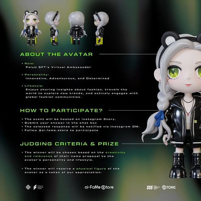 The event will be hosted on the @ai.fame.store Instagram Story from. Please submit your answer in the chat box. The selected response will be notified via Instagram DM. The winner will be chosen based on the creativity and relevance of their name proposal to the avatar’s personality and lifestyle. As a token of our appreciation, the winner will receive a physical figure of the avatar.