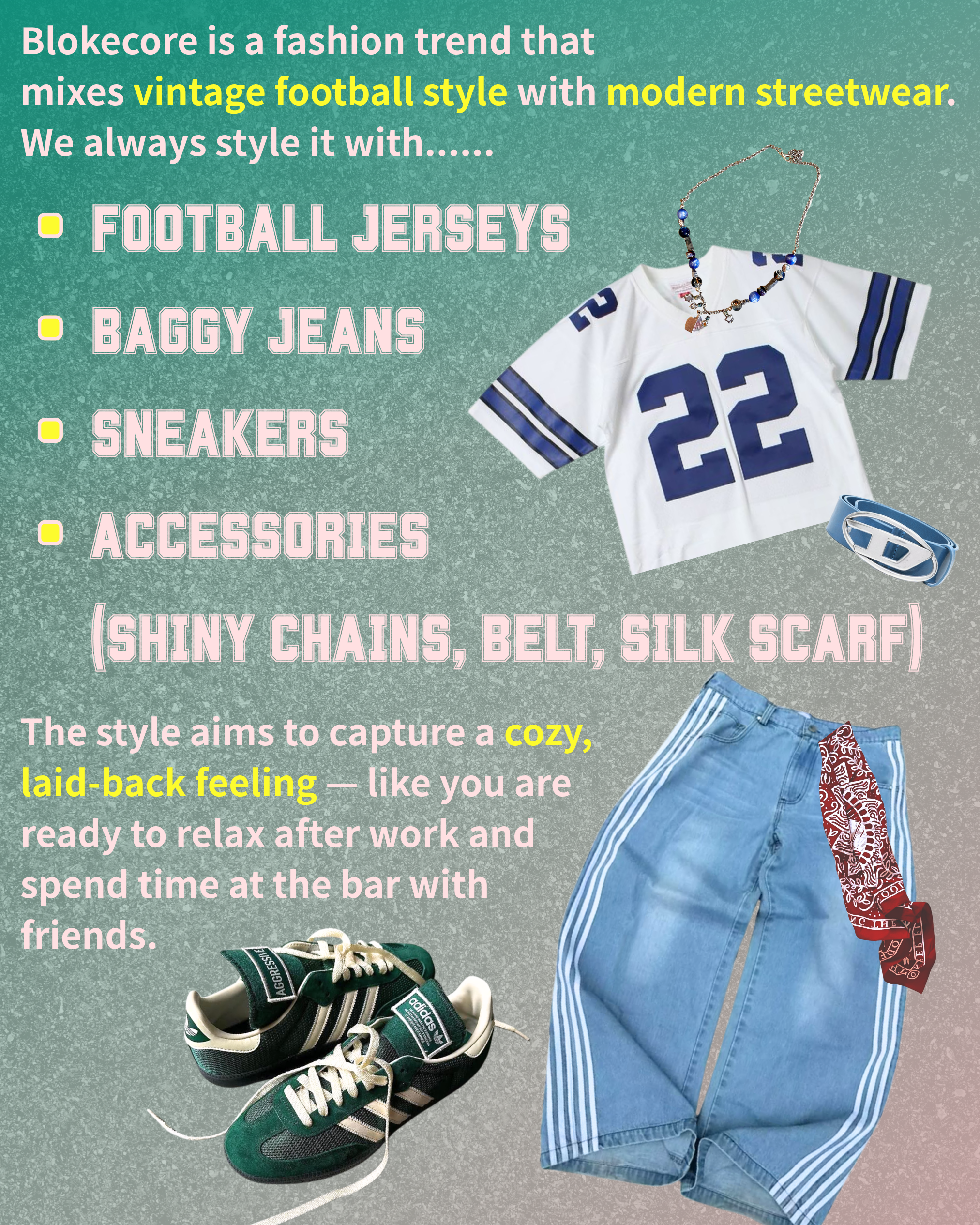 Blokecore is taking over the fashion game! From bold football jerseys to unexpected textures and cozy accessories, this trend fuses vintage soccer vibes with modern flair. Whether you’re hitting the pub or the runway, blokecore is all about mixing comfort with attitude for a look that’s uniquely yours.