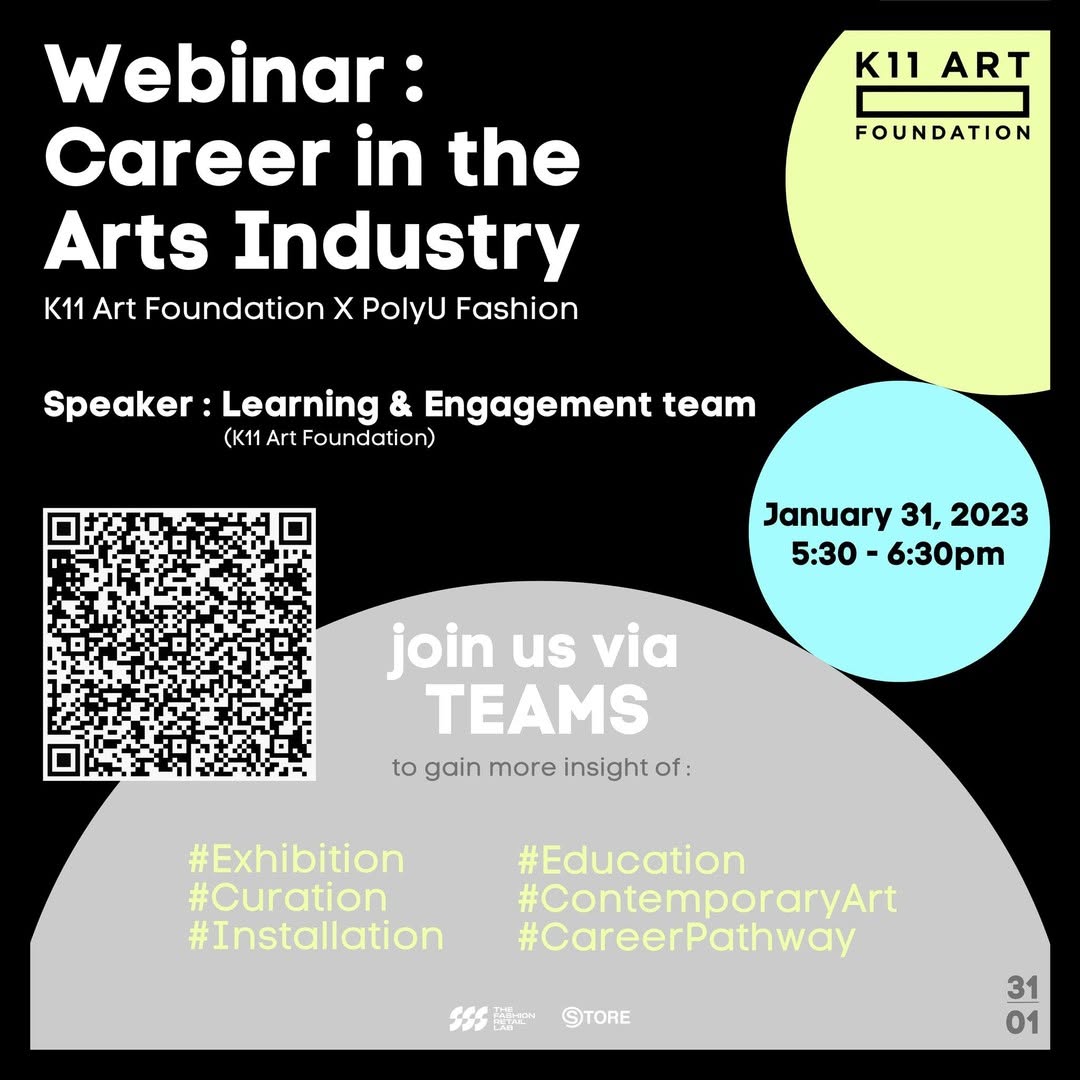 Join this talk presented by the Learning & Engagement team of the K11 Art Foundation via TEAMS on Jan 31 (Mon) at 5:30 pm, and find out how a non-profit art organisation fosters the development of contemporary art through exhibitions, artist residencies, and educational programmes. Learn more about career opportunities in the arts industry and in K11 Art Foundation’s upcoming art programmes.