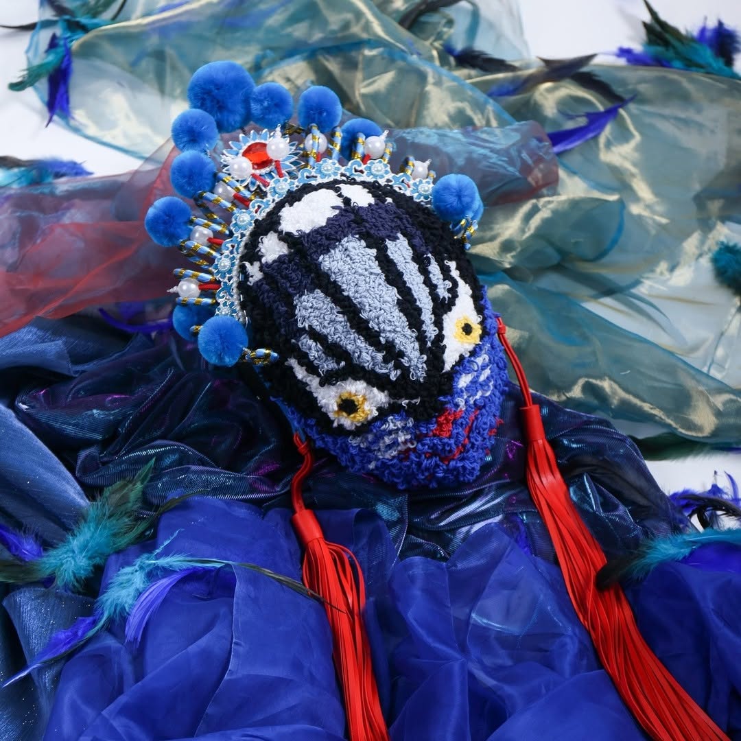 Dr Tsai-Chun Huang @huangtsaichun picked the God Guardians, ‘Pat ka chiòng (八家將)’ from Taiwanese folklore adopting his new interest in hand-tufting technique to create this design on a fencing mask based on the geometrized images of lotus leaves and flowers. The tufting yarns give a different and soft texture than the sharp and traditional makeup, so the audience may find it less scary to approach and appreciate the traditional culture.