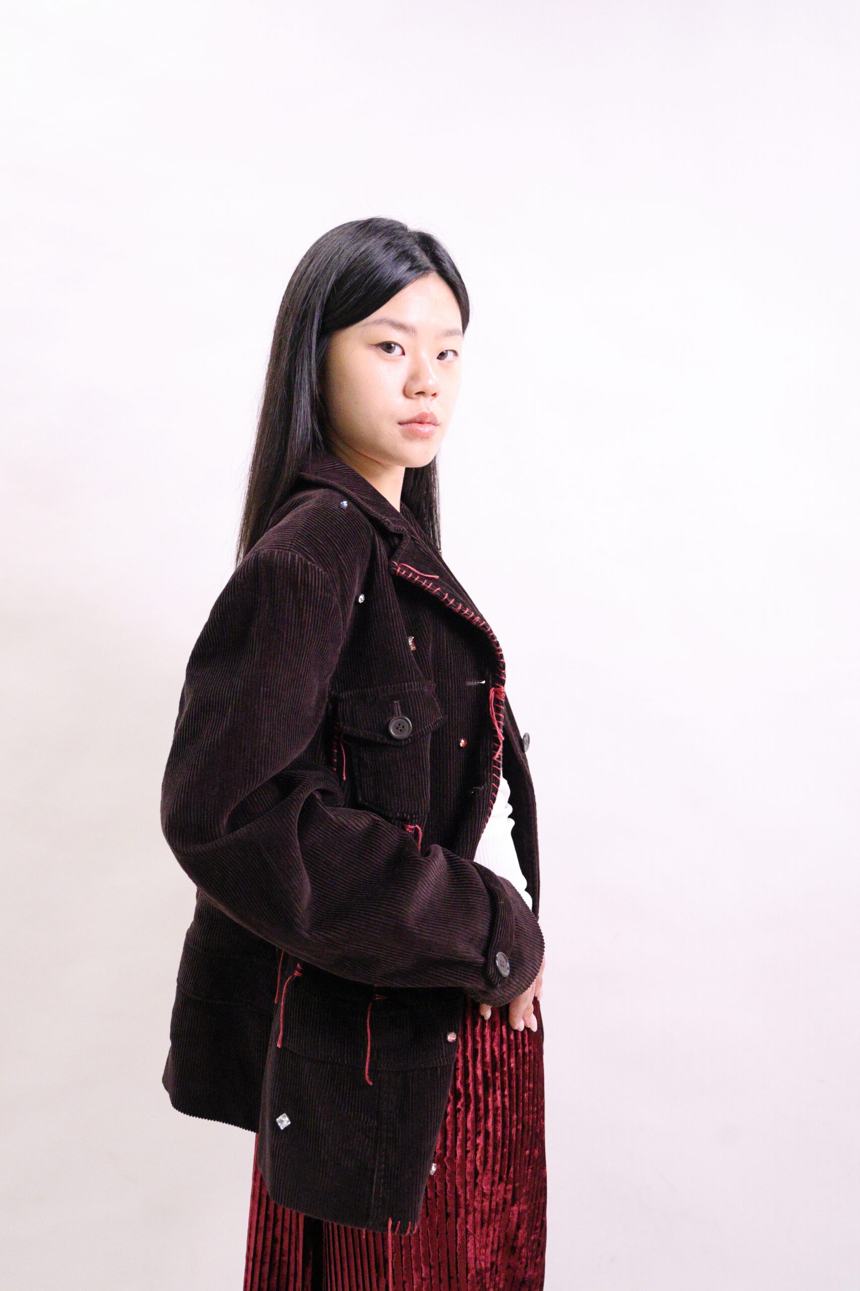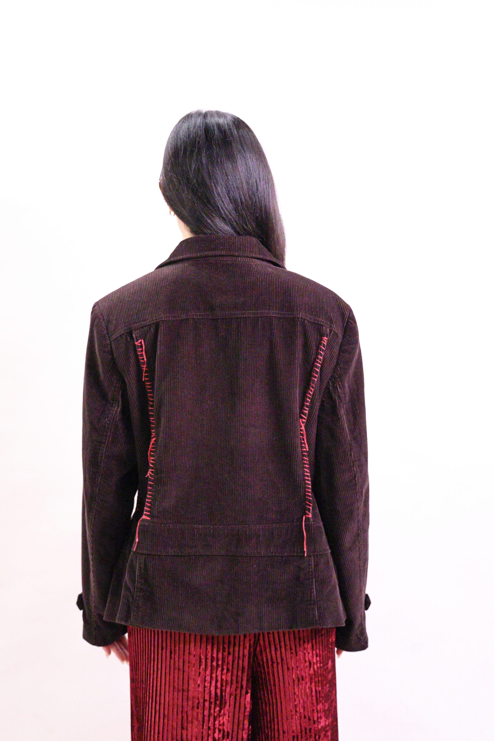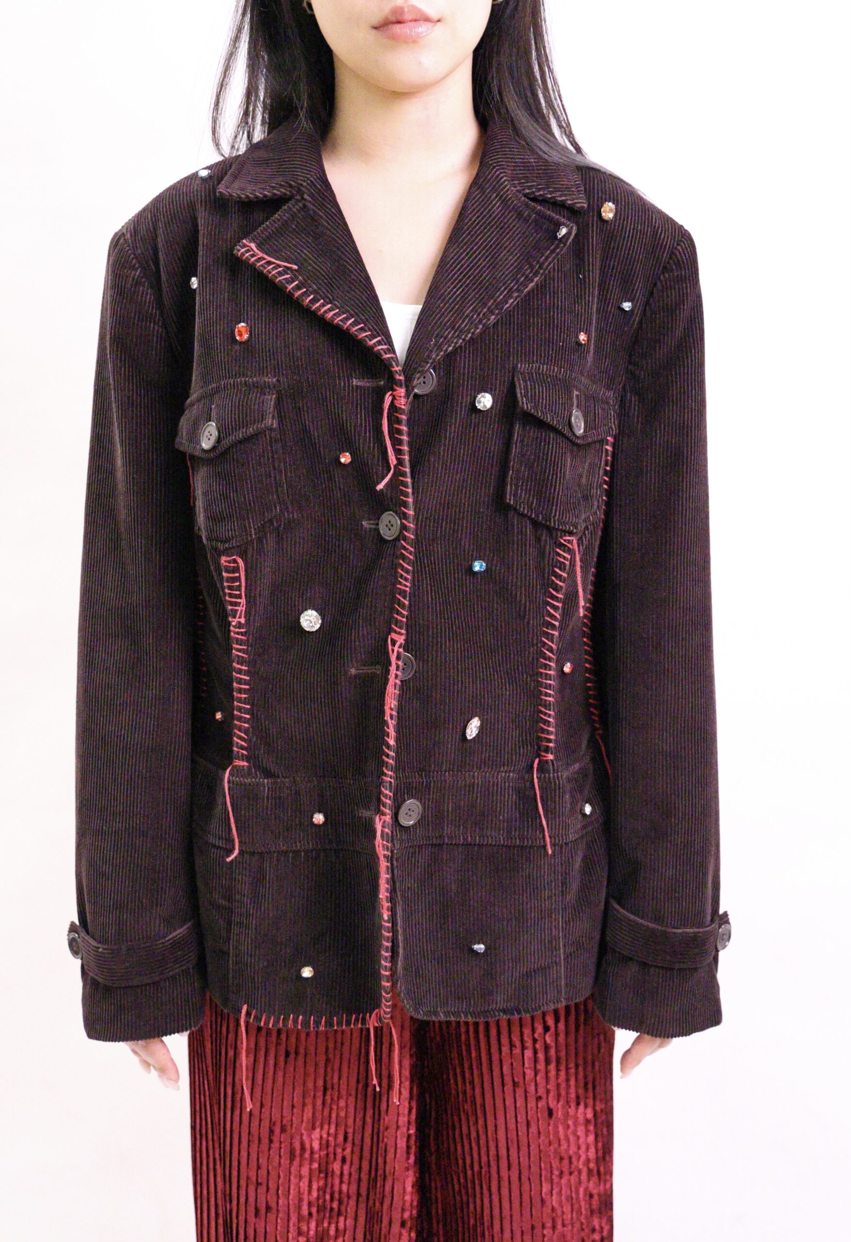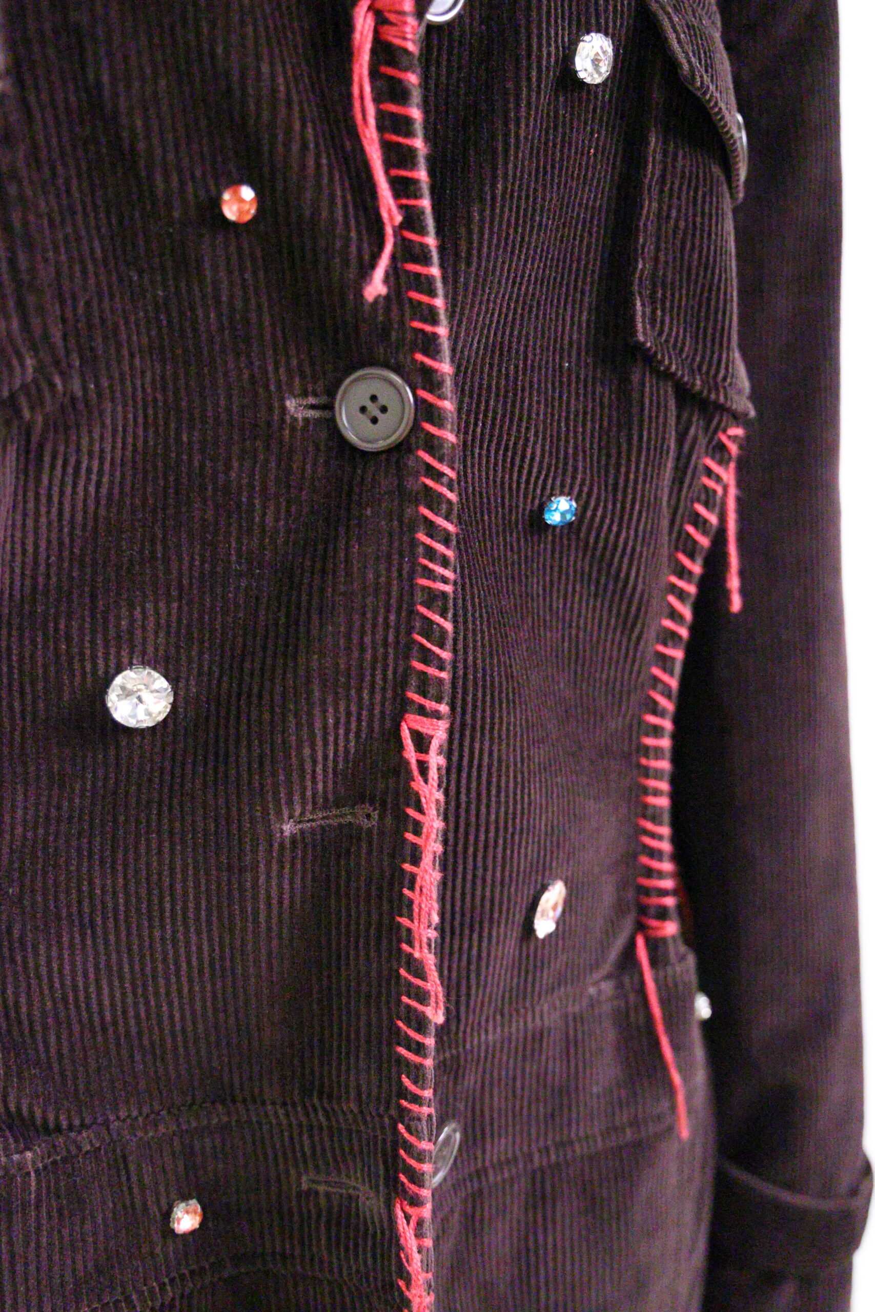 Dark brown corduroy jacket with contrast red stitching, sparkling gems, flap pockets, and a relaxed tailored fit