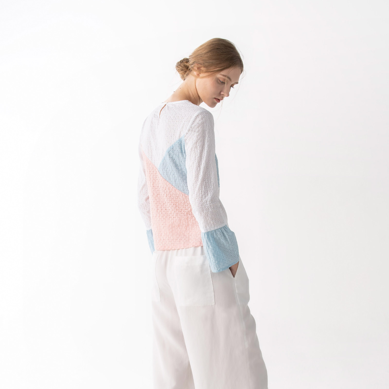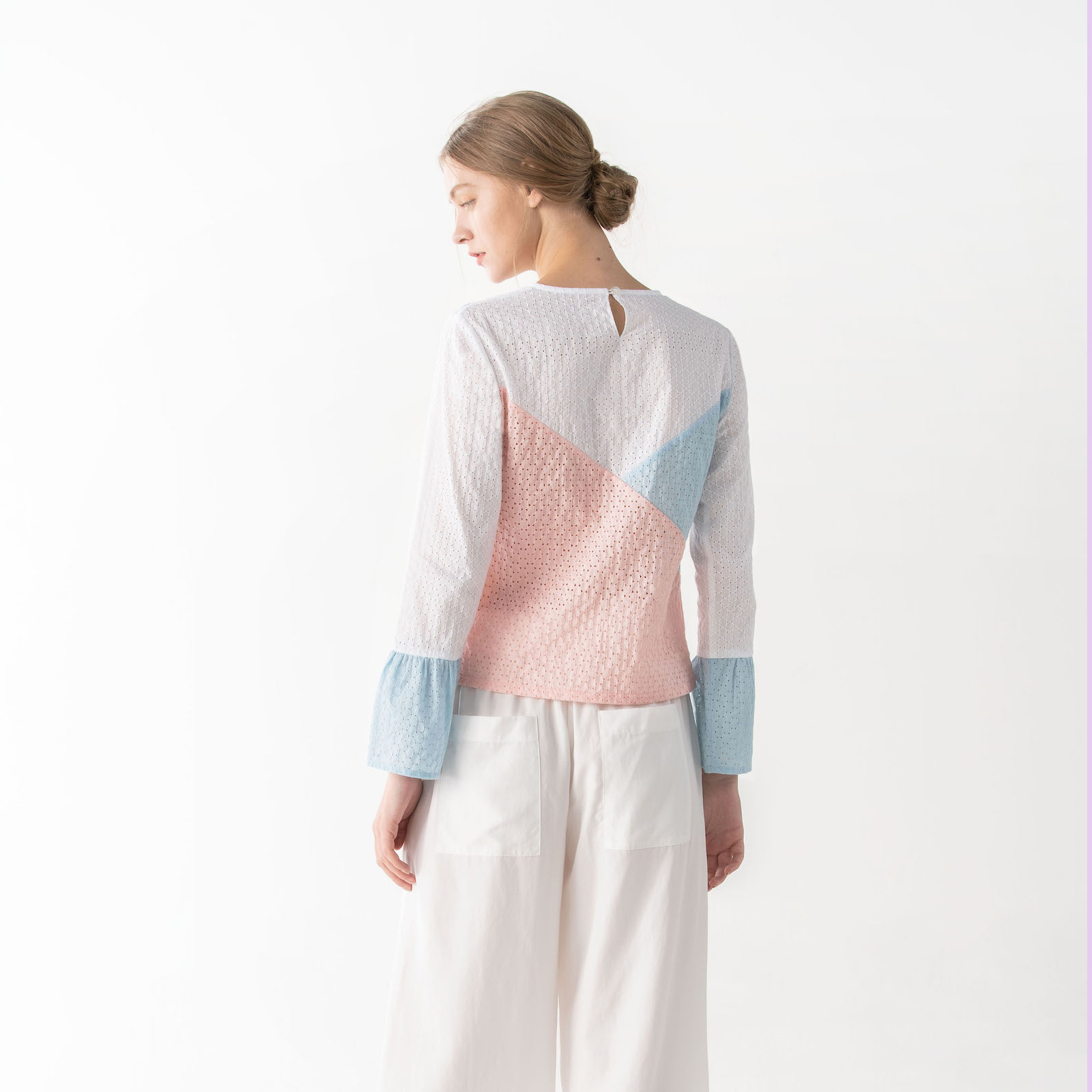 This blouse features soft color blocking at both front and back and flare sleeve design. It is made in high quality smooth and sophisticate fabric.