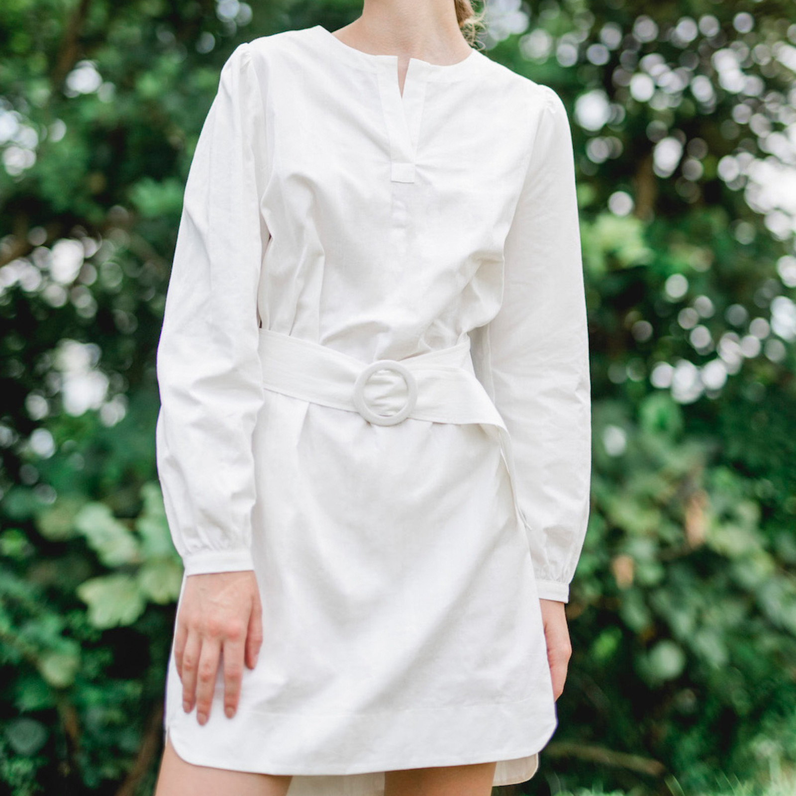 Easy fit and elegant. It can be either shift dress or just put on the buckled waist belt to create the waisted feminine look. The dress features gathered shoulder, gathered cuff and curvy hem design. Delights with subtle stripe pattern.
