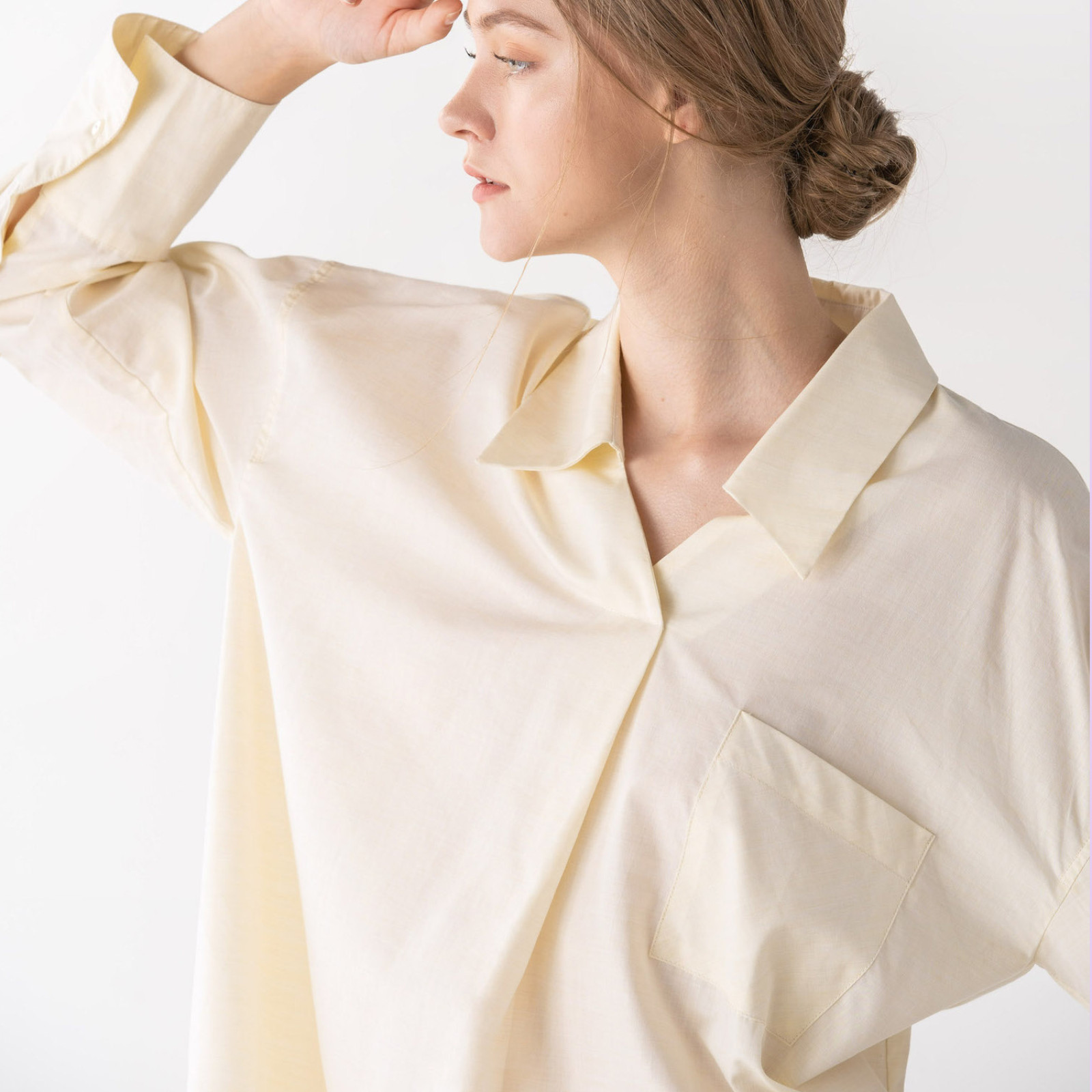 This eco shirt features a pointed collar and front pleat design. Cutting is relax and boyfriend fit.