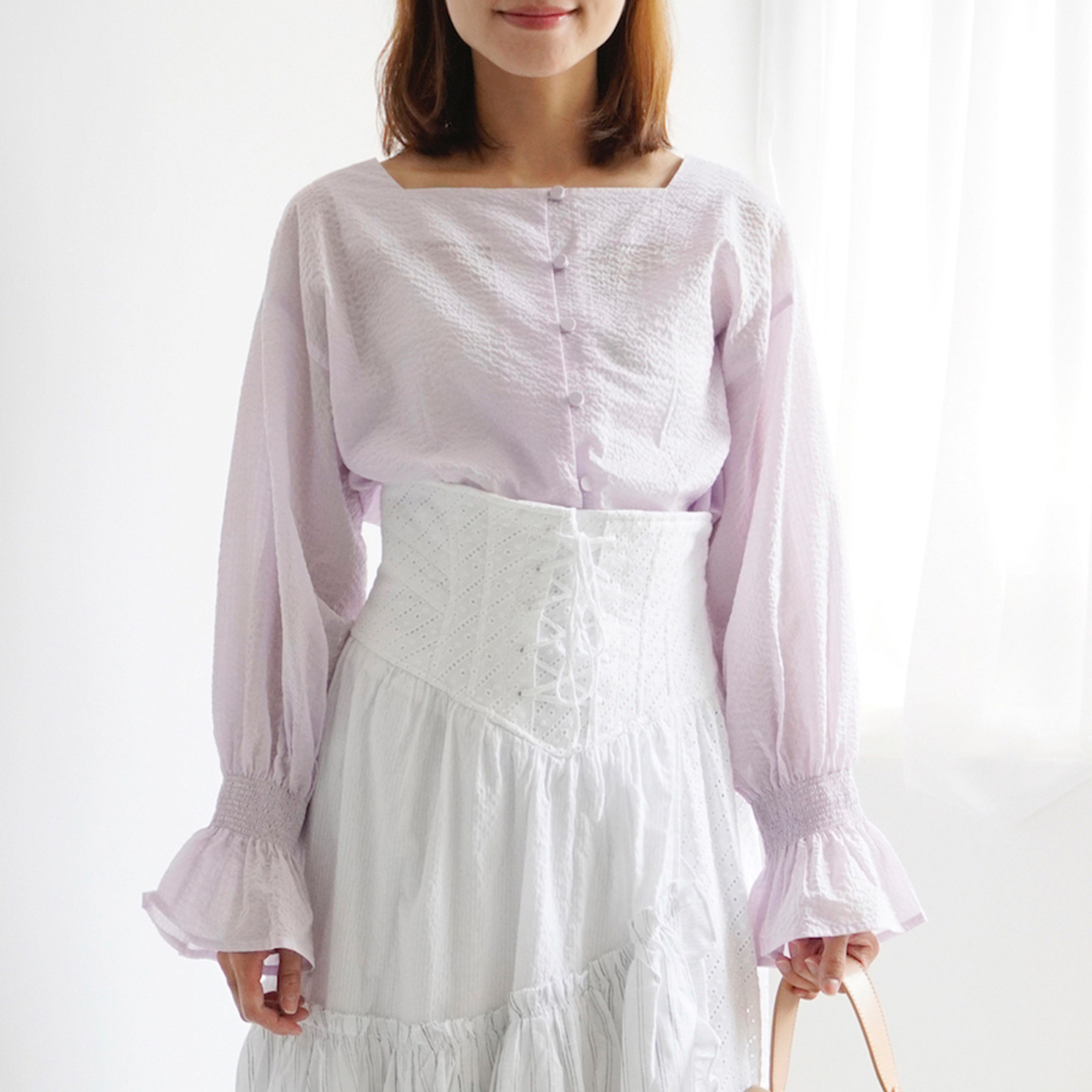 This feminine top features square neckline, button-up front and elastic smocking sleeve design.