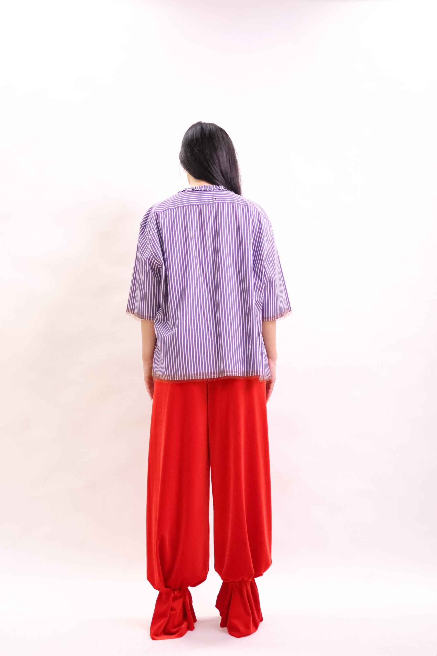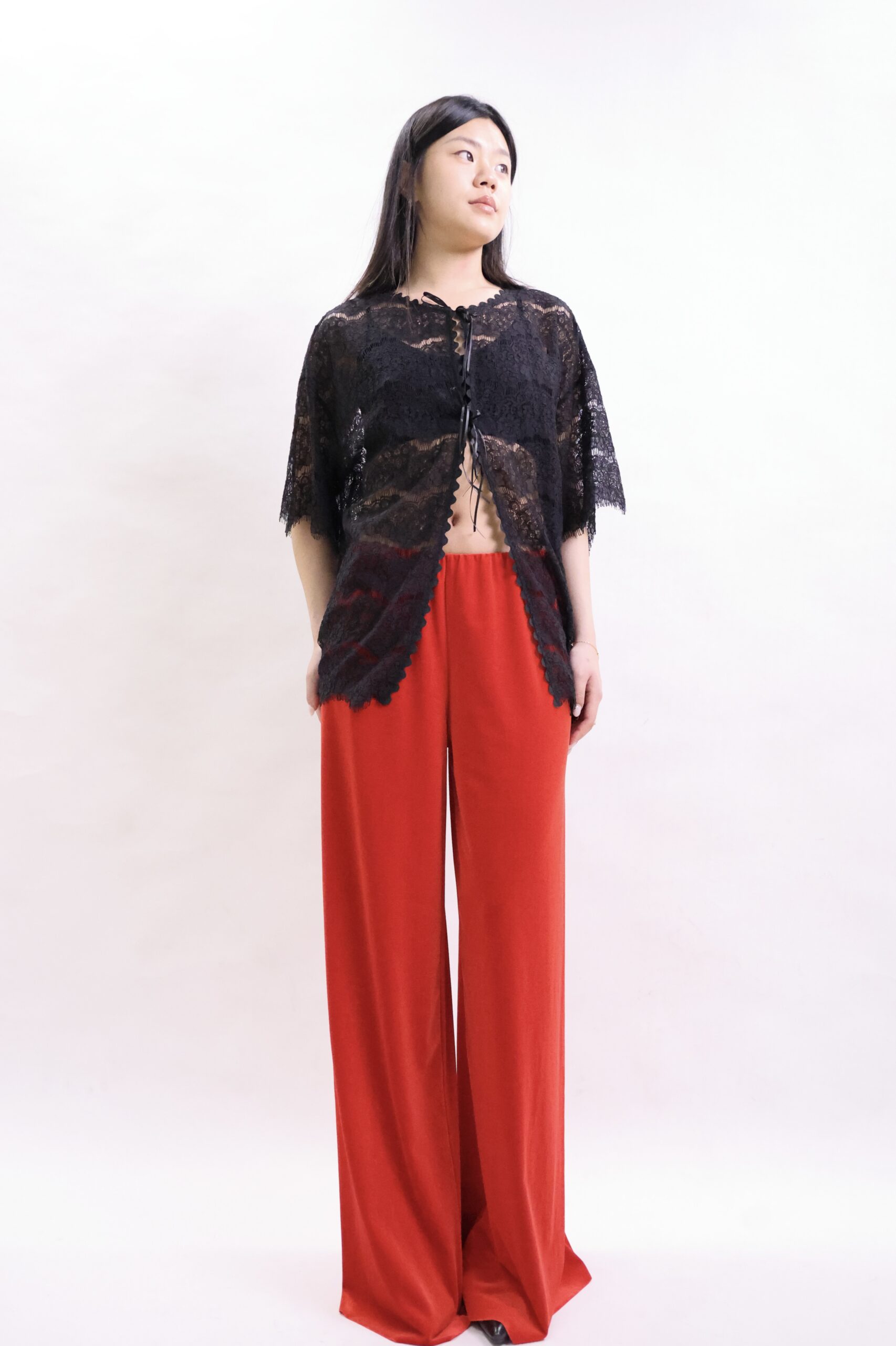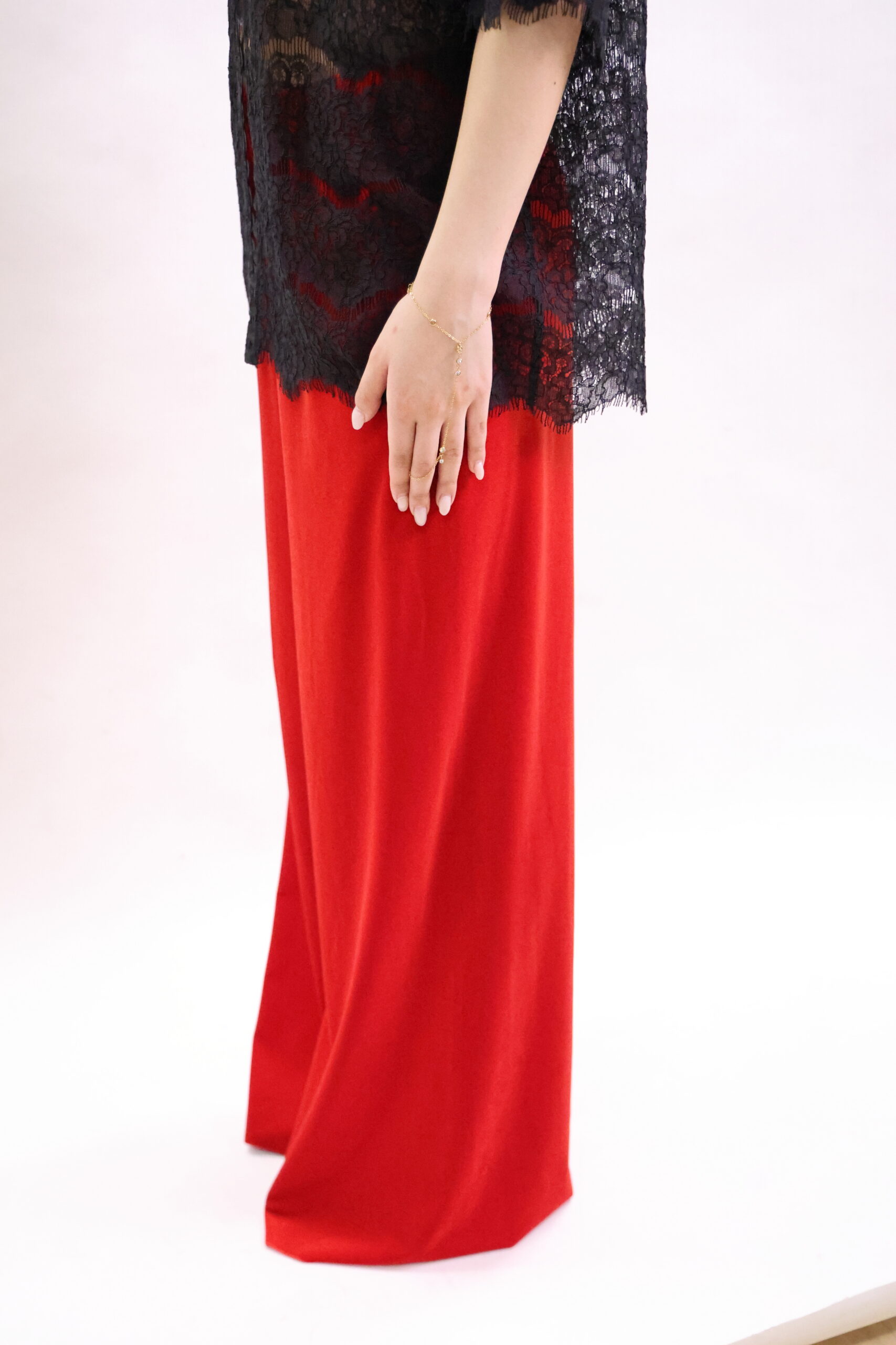 Red pants made of pleated velvet with a wide-leg silhouette with elastic waistband, fluid drape, and statement texture