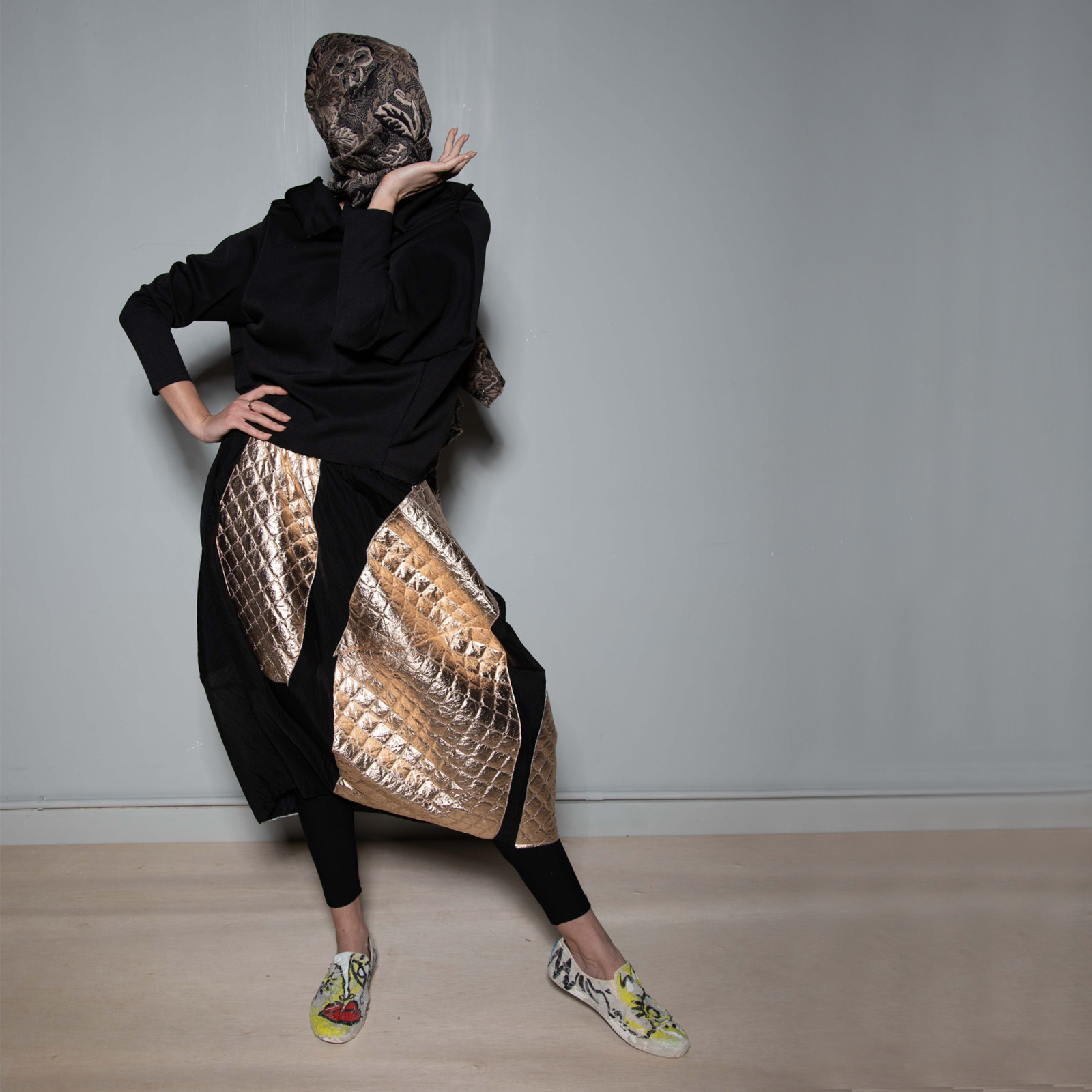 A cocoon skirt with panels of irregular shape quilting on a semi-transparent layer